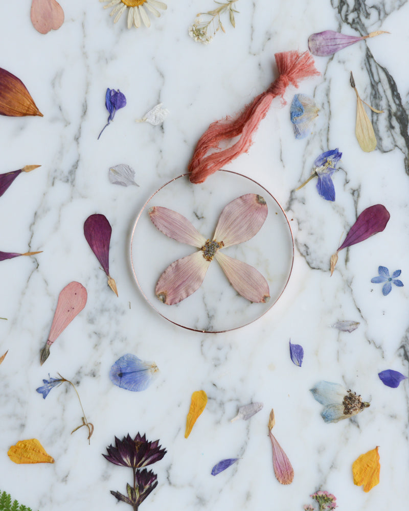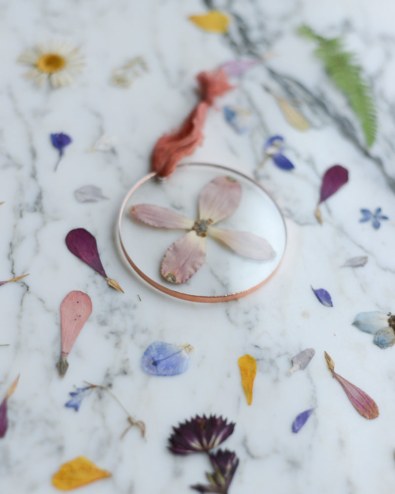 This listing is for a single round acrylic ornament. Constructed of two 3" diameter acrylic rounds, this ornament features a real pressed pink dogwood flower inside. The floral material was grown in my own garden, gathered and pressed by hand in a chemical- and dye-free process. The edges are finished with a thin copper and the piece hangs from a length of raw-edge, recycled silk chiffon ribbon (see photos).