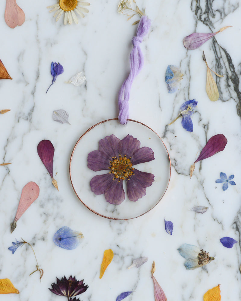 This listing is for a single round acrylic ornament. Constructed of two 3" diameter acrylic rounds, this ornament features a real pressed cosmos flower inside. The floral material was grown in my garden, gathered and pressed by hand in a chemical- and dye-free process. The edges are finished with a thin copper and the piece hangs from a length of raw-edge, recycled silk chiffon ribbon (see photos).