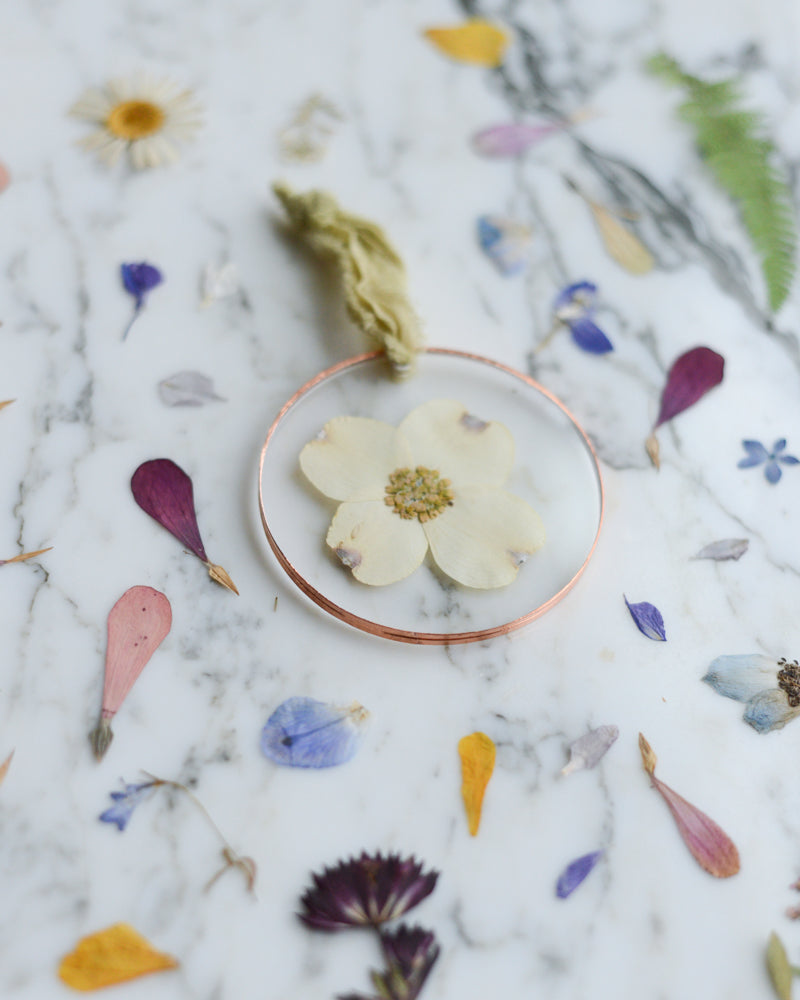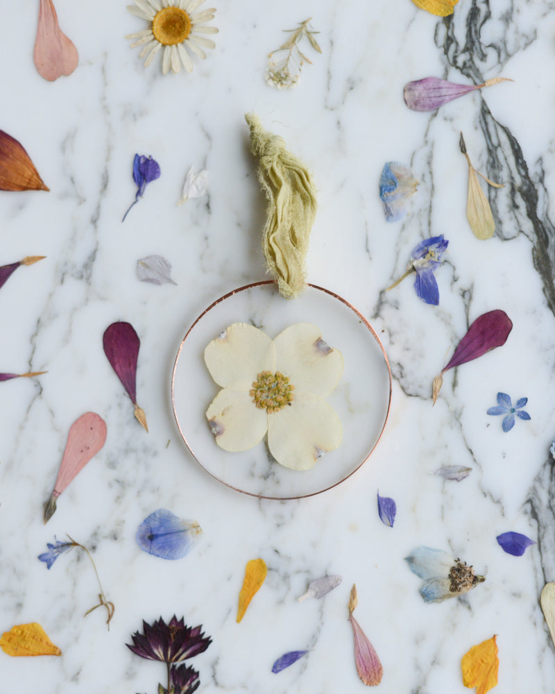 This listing is for a single round acrylic ornament. Constructed of two 3" diameter acrylic rounds, this ornament features a real pressed white dogwood flower inside. The floral material was grown in my own garden, gathered and pressed by hand in a chemical- and dye-free process. The edges are finished with a thin copper and the piece hangs from a length of raw-edge, recycled silk chiffon ribbon (see photos).