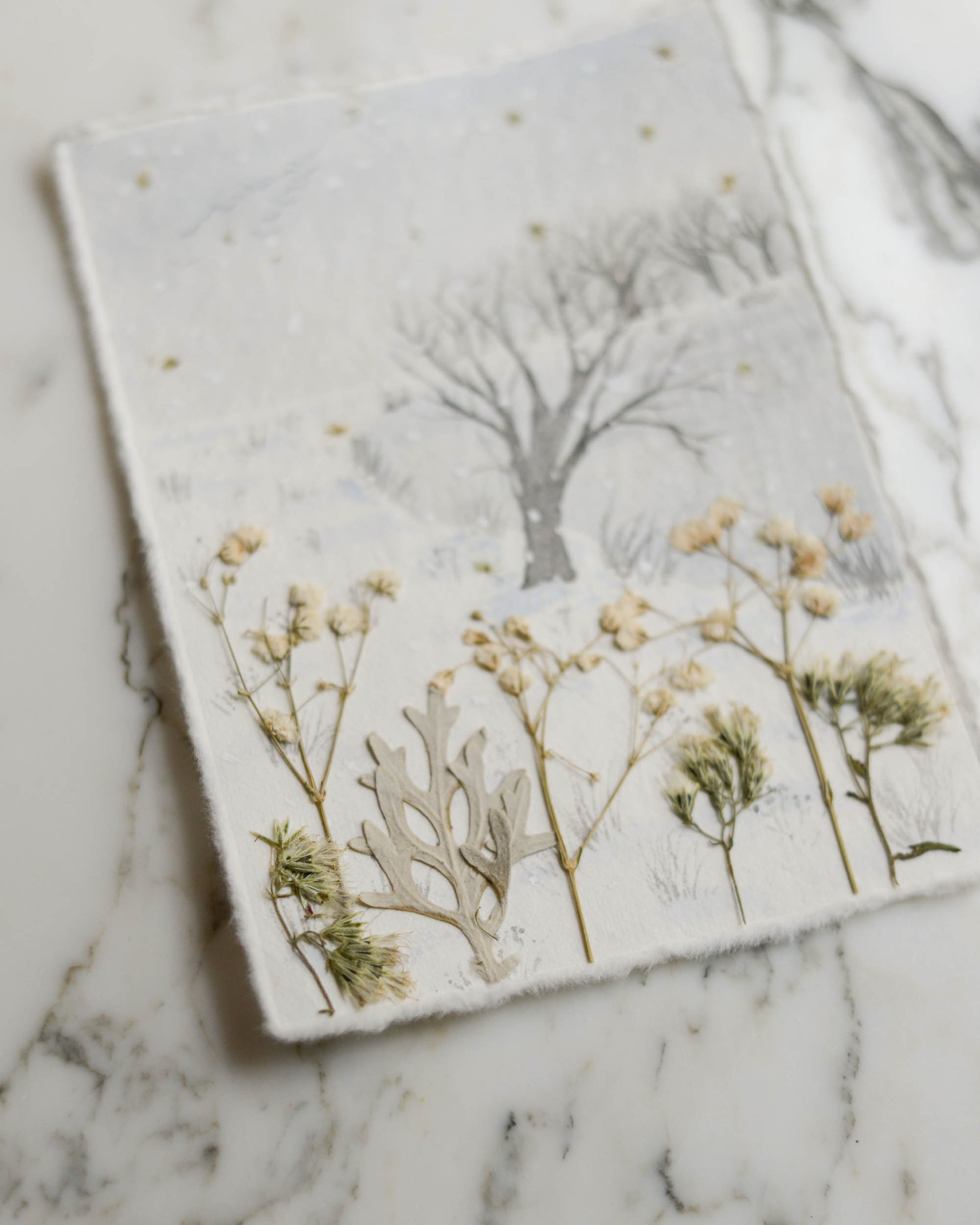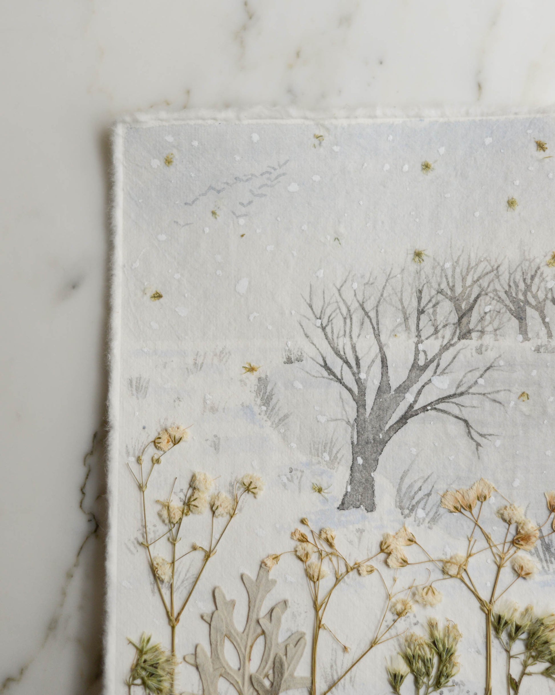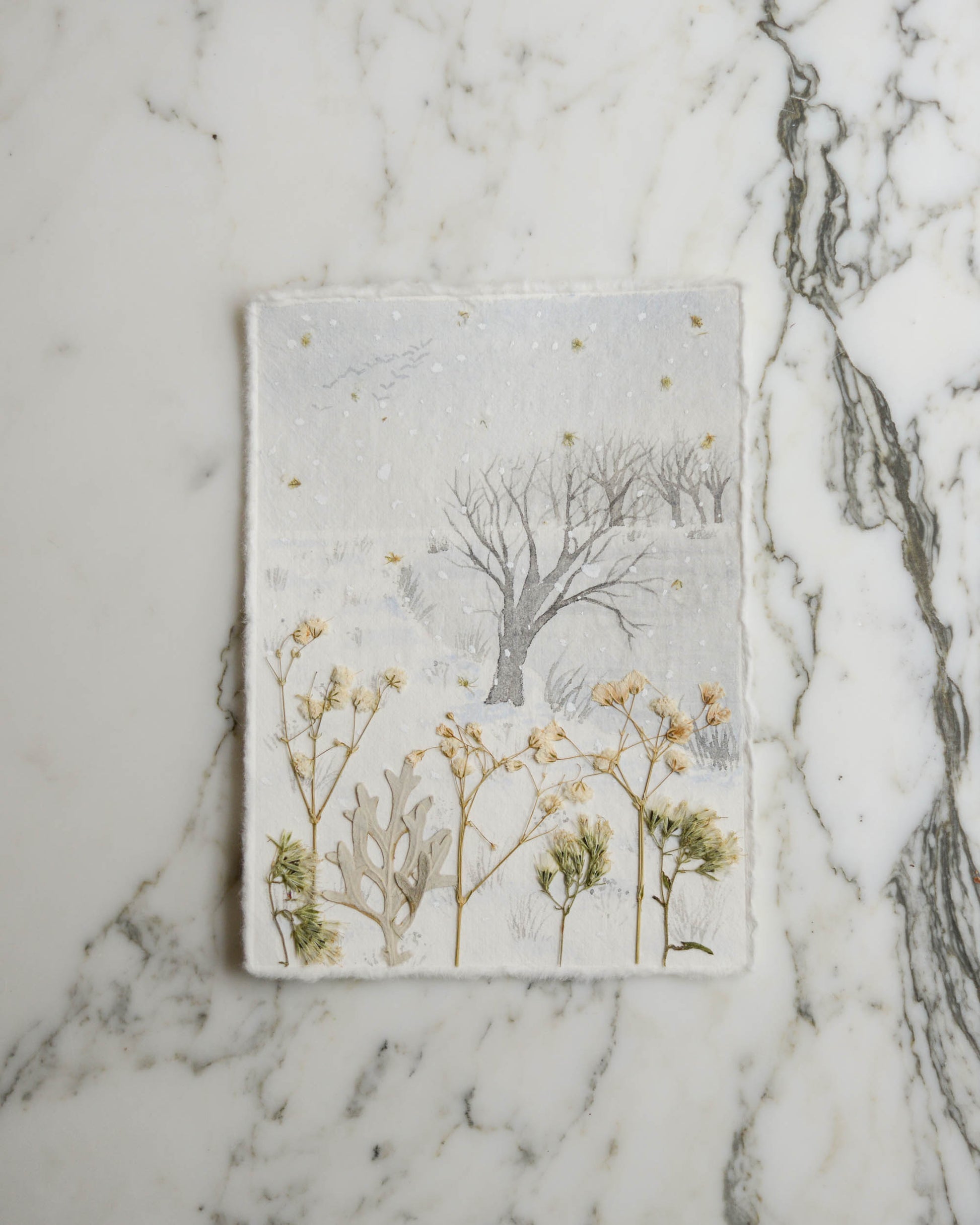 This listing is for an UNFRAMED, ORIGINAL botanical watercolor artwork. This mixed-media piece features a winter meadow landscape painted in watercolor on handmade, rough-edged paper, finished with a collection of small pressed flowers. The flowers were pressed by hand through a chemical- and dye-free process. It measures approximately 5x7". Please note that the listing photos illustrate the exact piece you will receive.