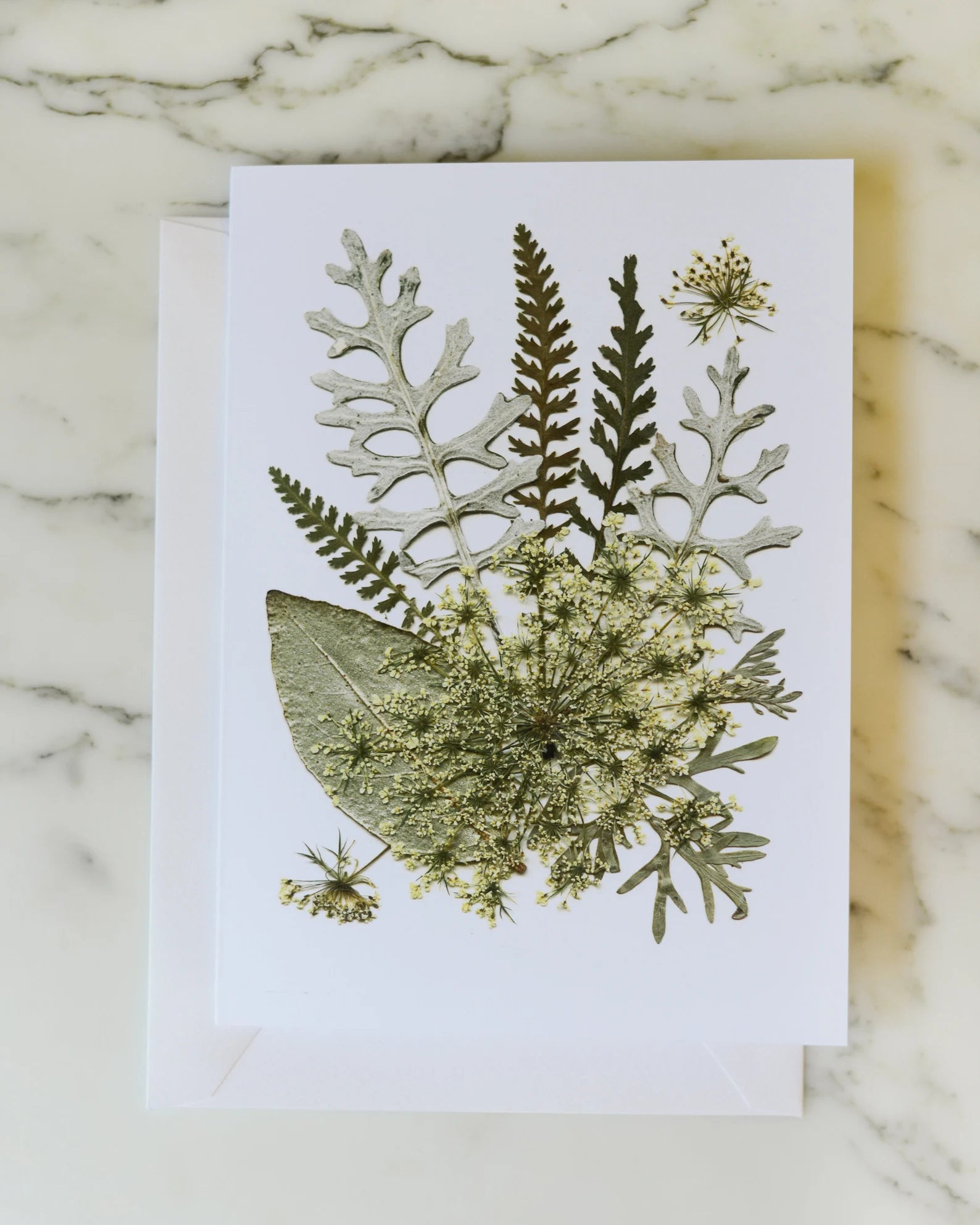 This listing is for a blank greeting card featuring kmpressed's own Four Seasons design: winter. This season is represented here through the use of dusty miller, yarrow, artemisia, russian olive, and queen anne's lace.