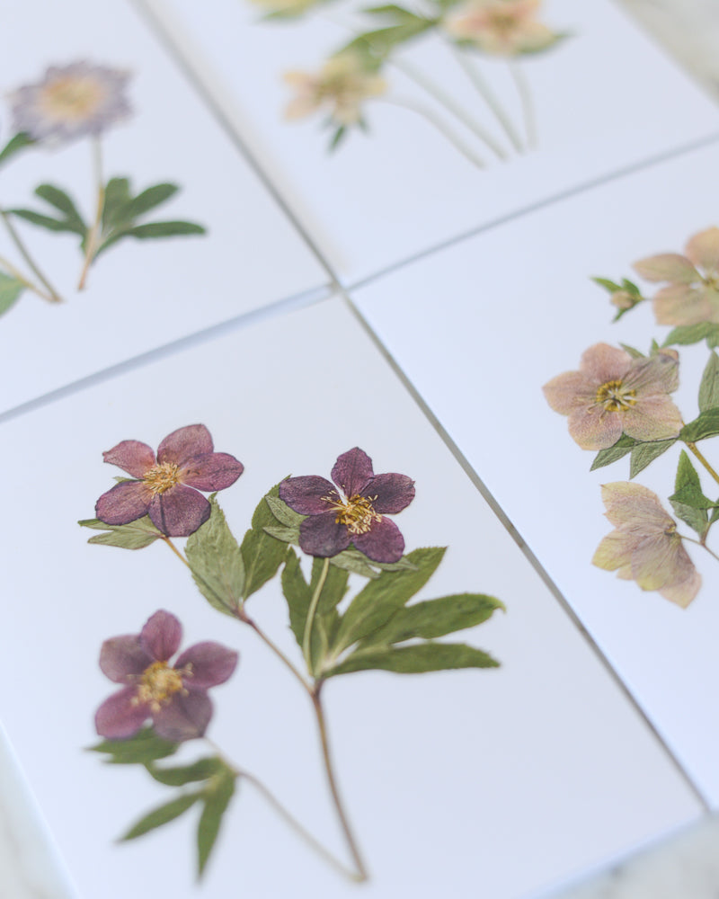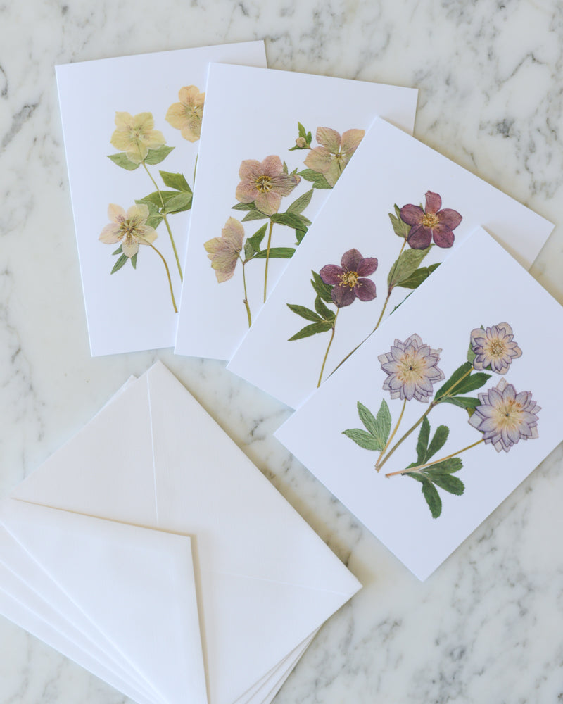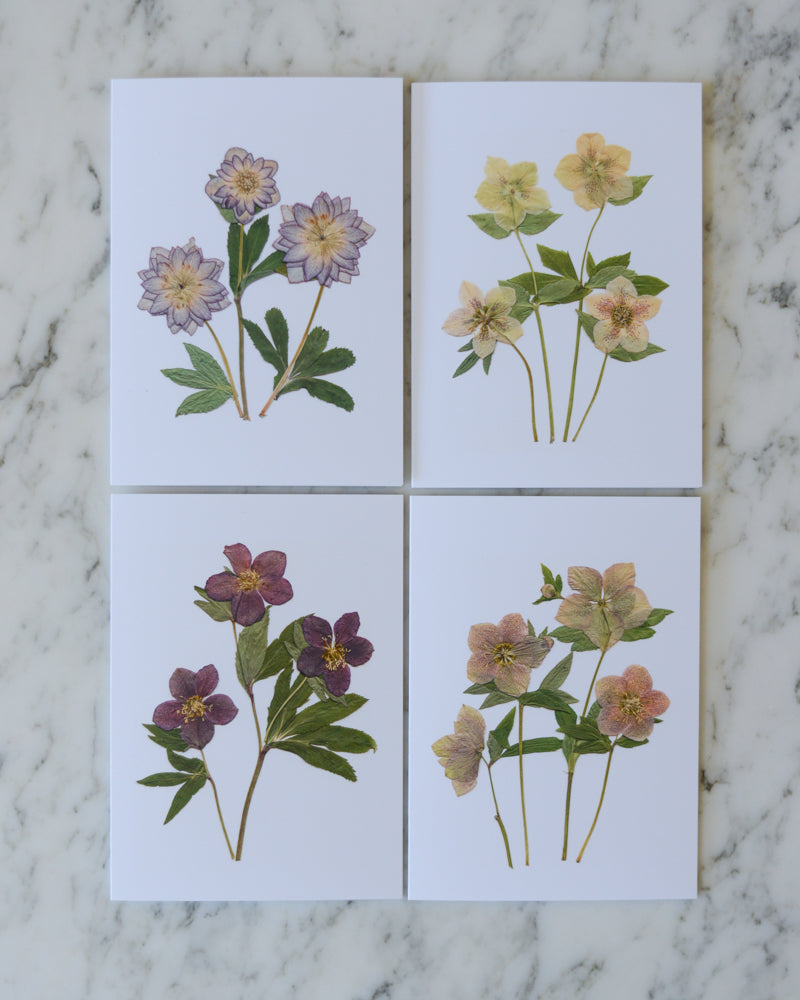 This listing is for a set of four or eight (4-8) blank greeting cards, each featuring the image of a different variety of pressed hellebore, mounted in the herbarium style. White linen envelopes are included.