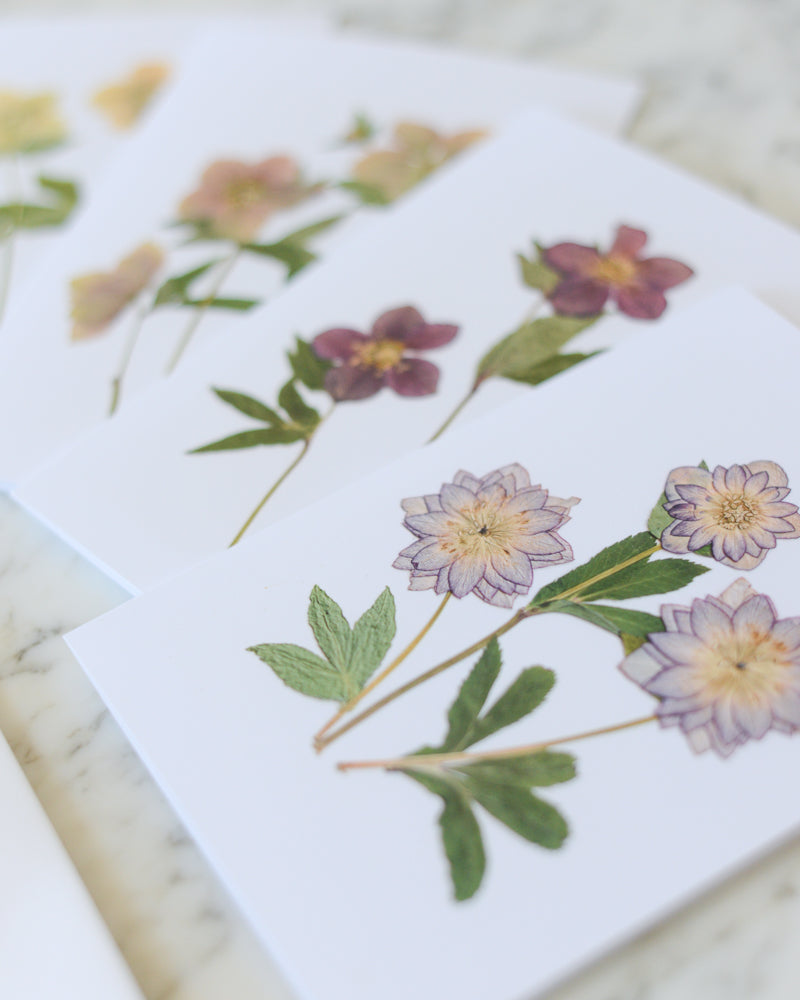 The original artwork was created using assorted pressed hellebores, then a high resolution scan was done to capture the lifelike detail in each one. The designs are printed on bright white 60lb cardstock and come with corresponding linen envelopes. They measure 4.5x6" and are blank inside, ready to be filled with your thank you note, birthday wish, or any other correspondence!