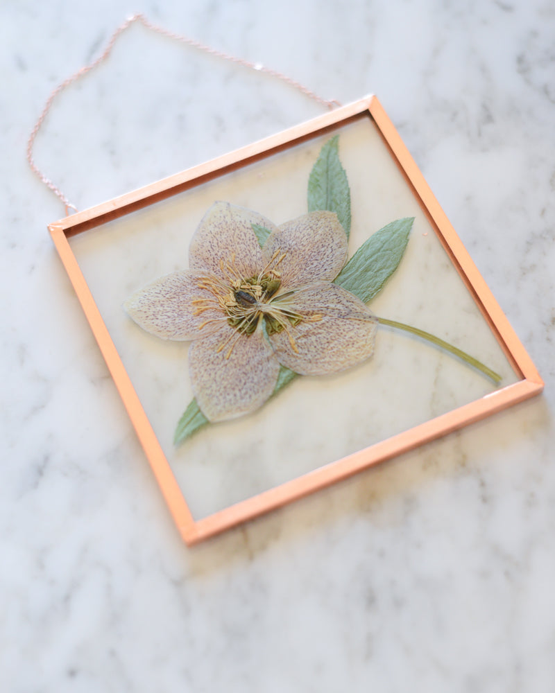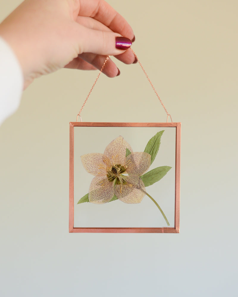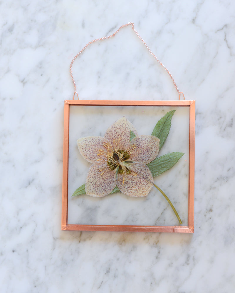 This is a real pressed flower (hellebore, collected in early spring) floating behind a pane of UV-resistant glass. It is edged in copper and equipped with a small copper chain, ready to hang on your wall. The plant material was gathered and pressed by hand through a natural, chemical- and dye-free process. This dainty piece measures approximately 4x4", perfect to brighten up a small section of your home or to include in a larger gallery wall.