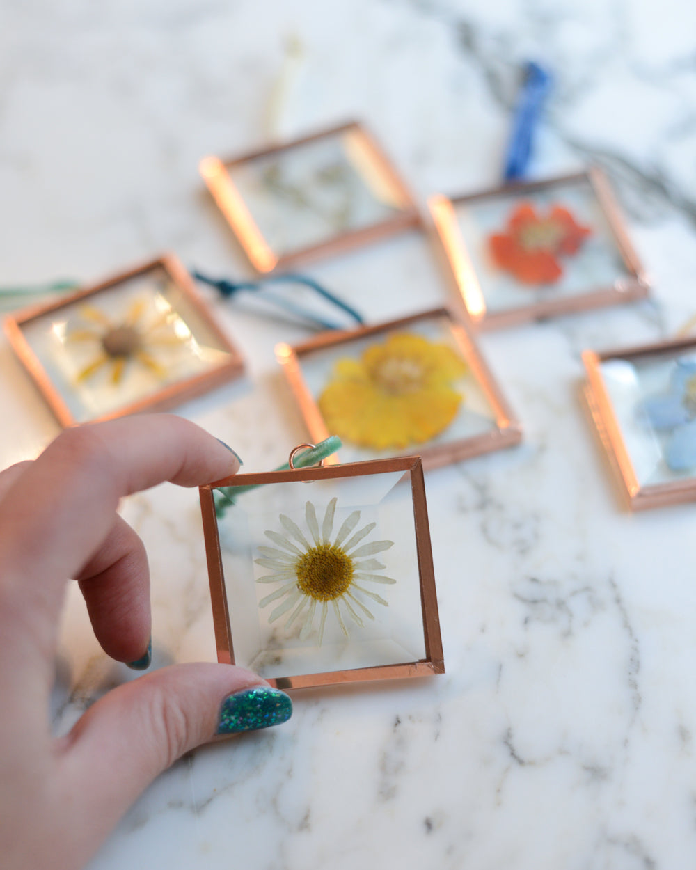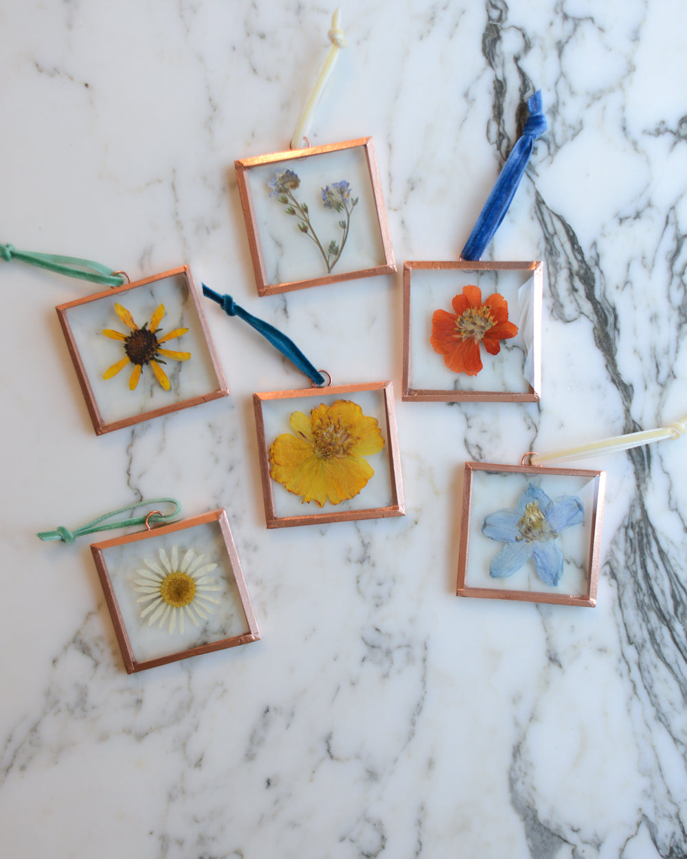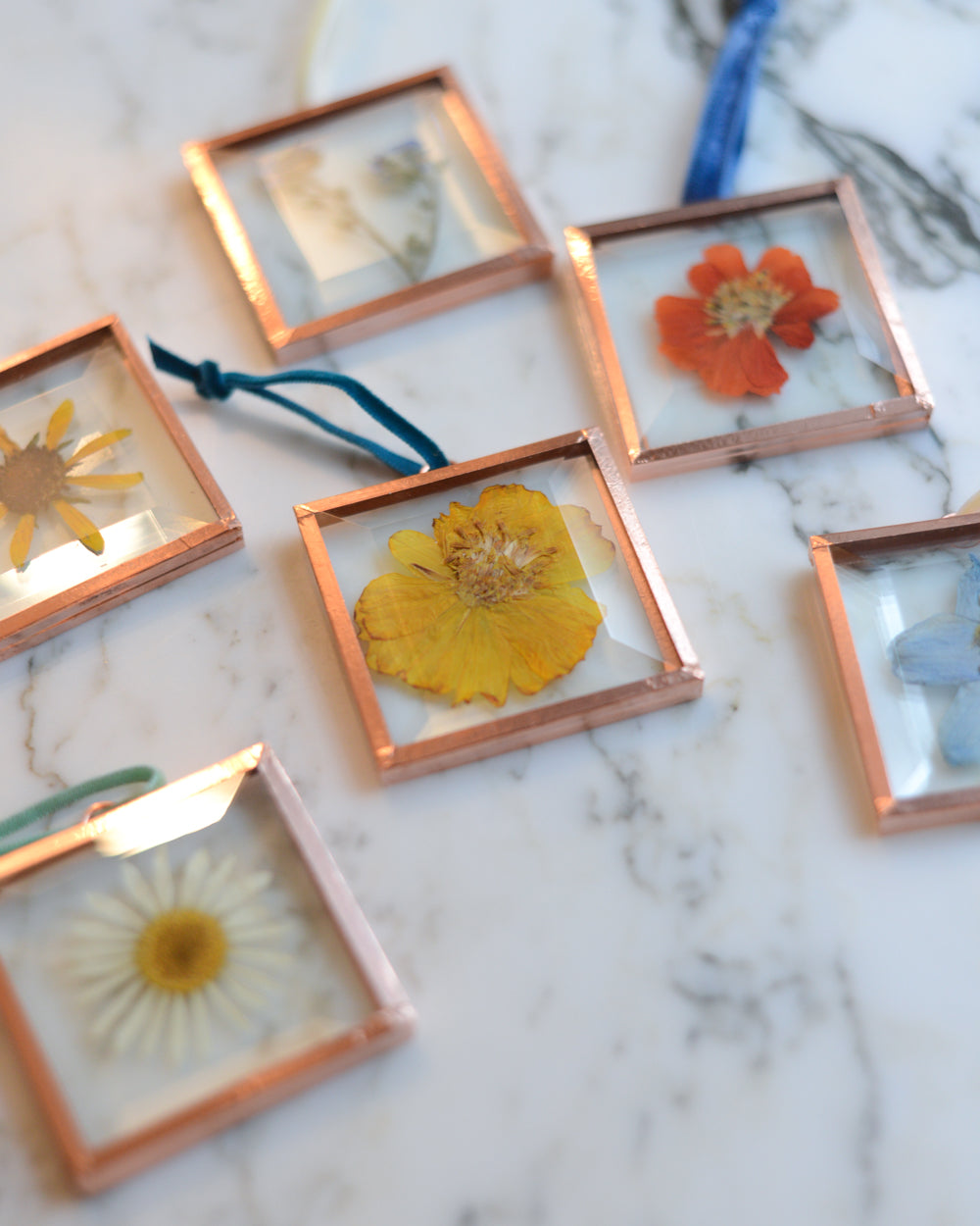 This listing is for a handmade ornament containing a real pressed flower (see options below). The piece measures 2x2", features beveled glass and copper edging, and is equipped with a length of velvet ribbon, making it ready to hang.