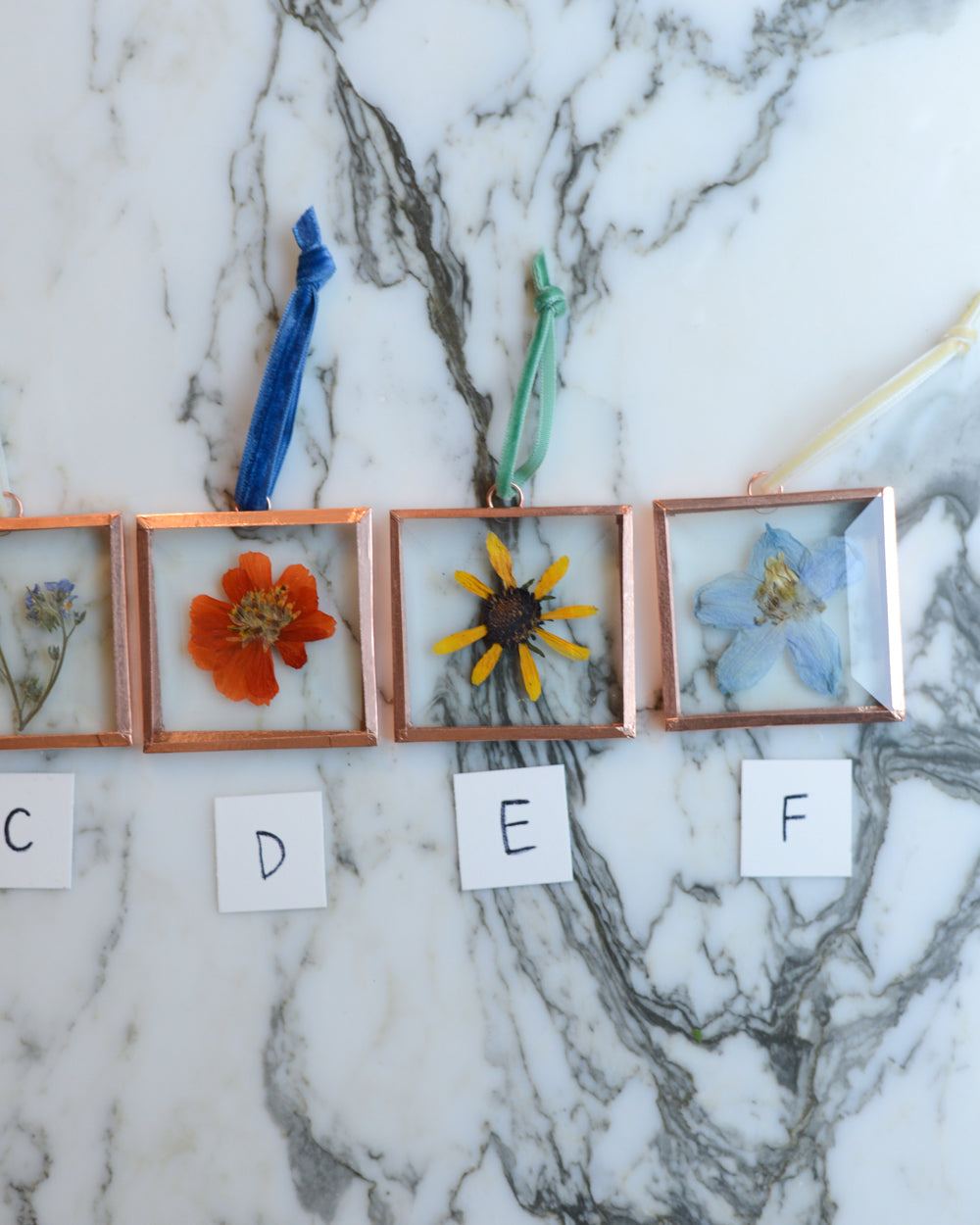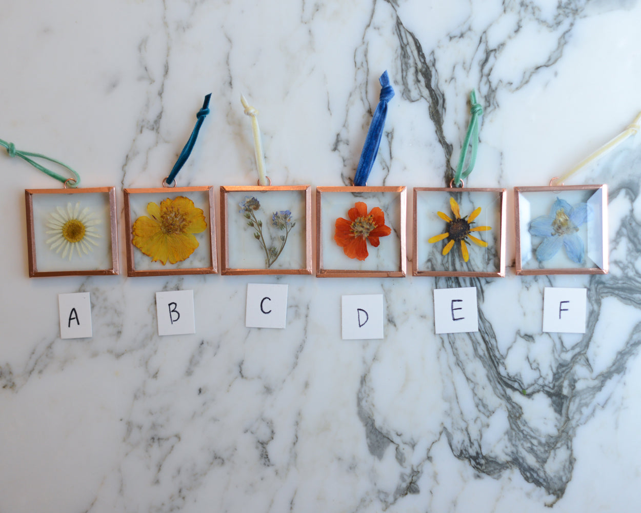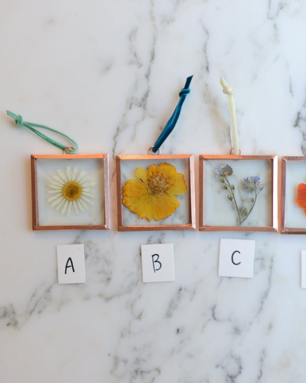 This listing is for a handmade ornament containing a real pressed flower (see options below). The piece measures 2x2", features beveled glass and copper edging, and is equipped with a length of velvet ribbon, making it ready to hang.