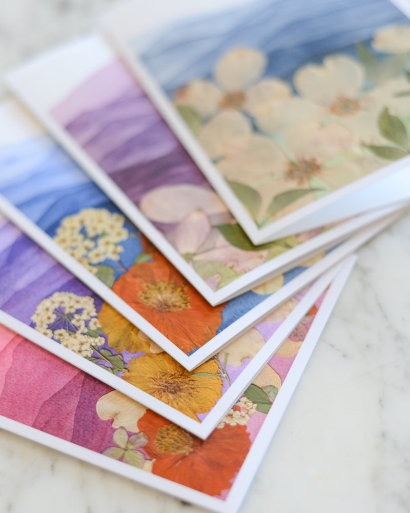 Mountain Home : A collection of mixed-media artworks featuring blooming landscape paintings done in watercolor and adorned with pressed flowers. The Mountain Home series features tonal layers of mountains and colorful pressed flowers: