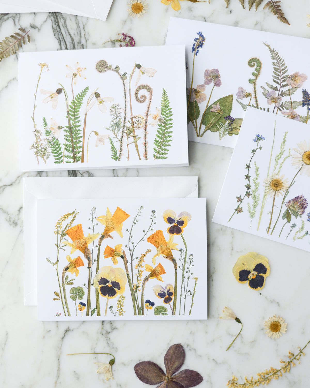 The original artworks were created using pressed flowers, many of which I grew myself and then gathered, pressed and designed especially for this format. Then, a high resolution scan was done to capture the lifelike detail in each one. The designs are printed on bright white 60lb cardstock and each comes with a corresponding linen envelope. Each card measures 4.5x6" and is blank inside.